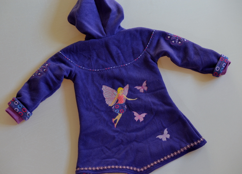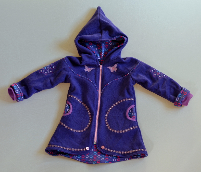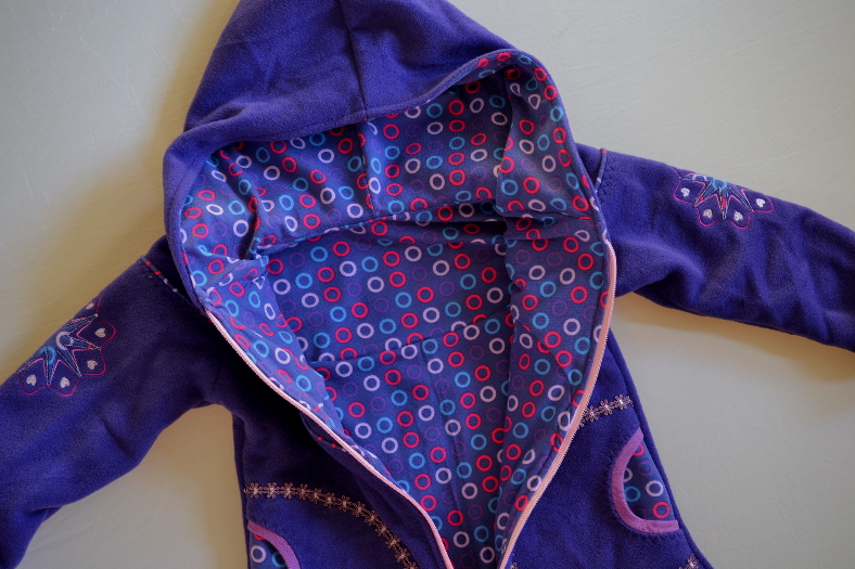 Aus den Resten hat sie dann noch eine Zwergenmütze genäht. Dabei hat sie nur die obere und die hintere Naht genäht und ich habe vorne mit der Nähmschine mit Zickzack ein Gummi aufgenäht und im Nacken ein Schrägband, dass dann auch die Bändel sind.