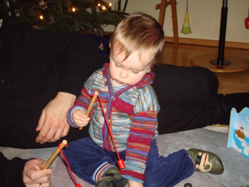 Hier noch ein Tragbild. Leider sieht man den Bagger beim Tragen nicht mehr ganz. Dafür ist der selbstgestrickte Pulli nochmal zu sehen.