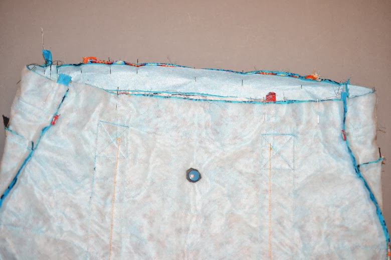 zwischen den Gurtbändern. Wichtig wäre noch, die Öffnung auf der Seite der “schmalen aufgesetzten Tasche” zu machen, dann habt ich später nicht so Probleme beim Schließen der Wendeöffnung.