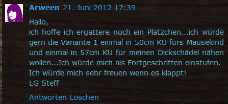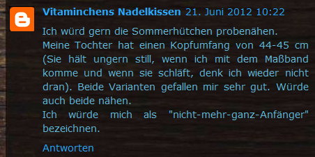 Der hier ist gestern Abend entstanden. Mich haben die Werke von meinen Probenäherinnen so inspiriert, dass ich unbedingt noch einen nähen musste.