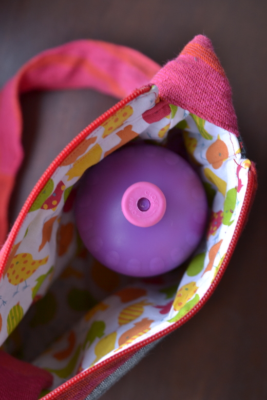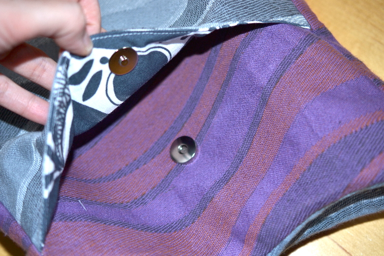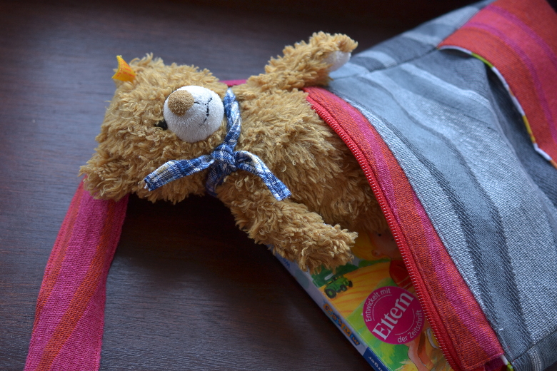 Für die Henkel hat der Tragetuchstoff nicht mehr gereicht, da habe ich dann Samt vom Elch verwendet. Ziemlich perfekt findet meine Mama, dadurch rutscht die Tasche nicht von der Schulter.