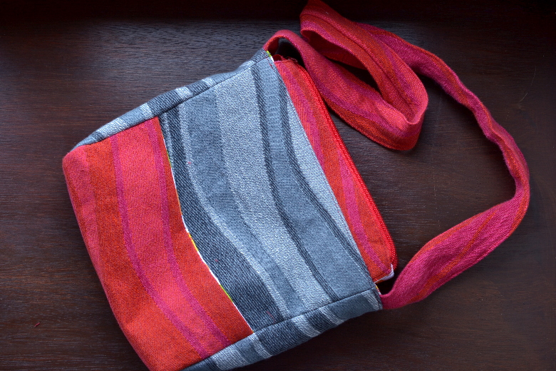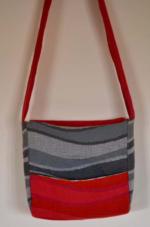 Ich habe den Schnitt ein bisschen geändert und anders als bei der ersten Tasche gemacht. Die extra-Tasche vorne ist der Wellenform etwas nachempfunden. Ich musste wirklich ganz schön zirkeln, aus den kleinen Stücken einen vernünftige Tasche zu bekommen.