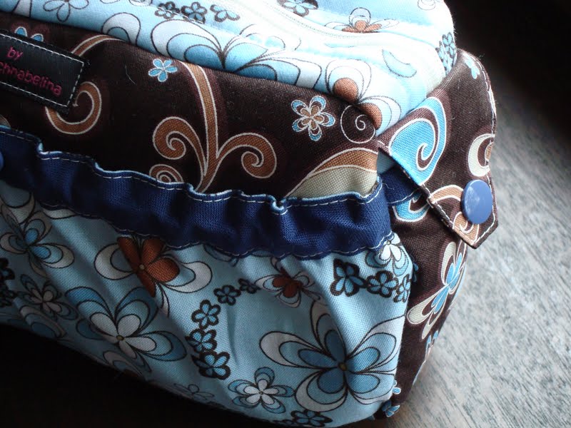 …und große Seitentasche innen. Die ist eigentlich für außen gedacht, aber mir haben die Bändel zum festhalten der Windeln nicht so gut gefallen. Die sind innen nicht notwendig.