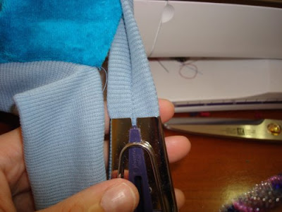 Es gibt spezielle Stopper zum kaufen aus Metall, die werden einfach angeklemmt. Theoretisch reicht es aber auch, wenn Du mit einem dickeren Garn und mit der Hand oben ein paar Schlingstiche machst, damit der Schieber da nicht drüber kann.