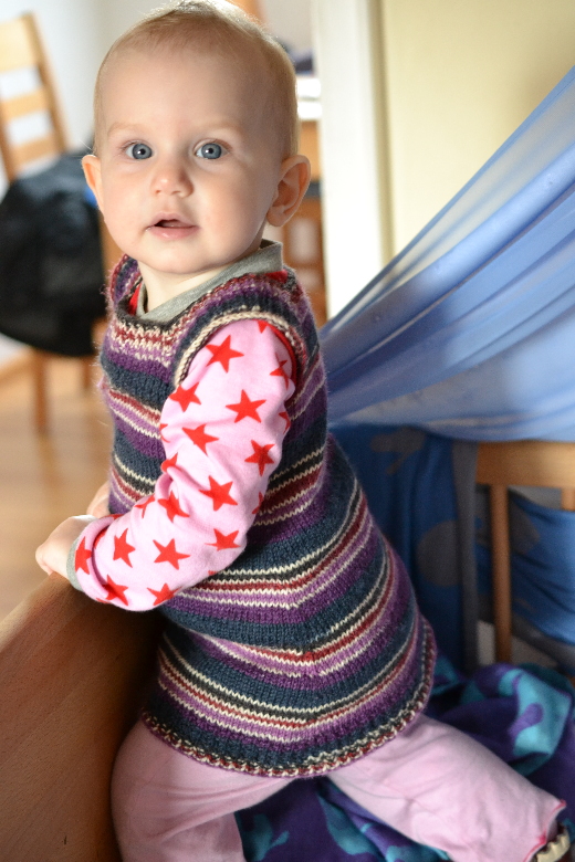 Heute hat sie es mit einem Polokragenbody an, das sieht auch echt zuckersüß aus. Ich bin schon am überlegen, ob ich noch eins brauch. Oder sollte ich vielleicht noch so ein Kleidchen stricken? Ich bin nämlich ganz happy, es passt sogar noch!